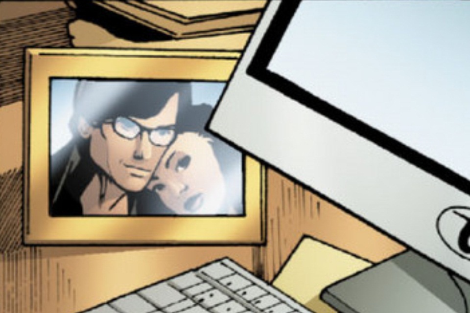 Meanwhile back at the Daily Planet it seems that Lois’s former intern, Jeff, has a little crush on our favourite reporter. He is sitting at Clark’s desk and staring at a picture that Clark has of Lois & Clark (love that by the way). This picture is a really cute couple shot of Clark (in glasses and looking a lot like Christopher Reeve) and Lois with her head on his shoulder. Anyways, it seems that Jeff wonders about what secrets Clark is holding and wonders if he loves Lois and much as she loves him to which Lois replies that Clark probably loves her more thus startling Jeff. It appears that Superman has whooshed/dropped off Lois at work after their rendez-vous in the previous issue.
