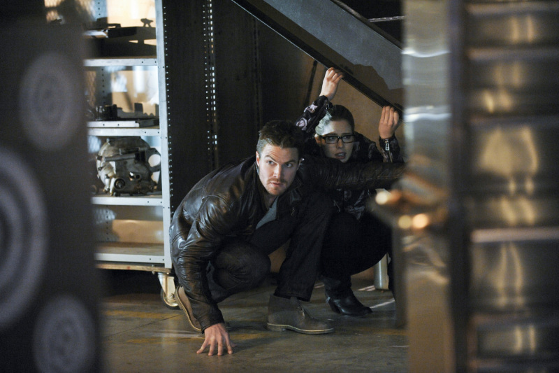 Arrow — “The Man Under the Hood” — Image AR219a_0165b — Pictured (L-R): Stephen Amell as Oliver Queen and Emily Bett Rickards as Felicity Smoak — Photo: Alan Zenuk/The CW — © 2014 The CW Network, LLC. All Rights Reserved.