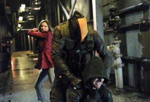 Arrow — “City of Blood” — Image AR221a_0208b — Pictured (L-R): Katie Cassidy as Laurel Lance, Mirakuru Soldier, and Stephen Amell as The Arrow — Photo: Alan Zenuk/The CW — © 2014 The CW Network, LLC. All Rights Reserved.