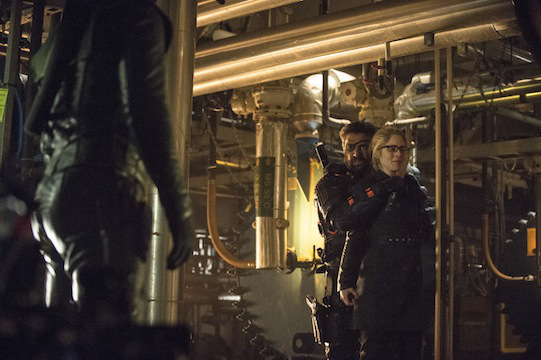 Arrow — “Unthinkable” — Image AR223b_ 0027b — Pictured (L-R): Stephen Amell as The Arrow, Manu Bennett as Slade Wilson, and Emily Bett Rickards as Felicity Smoak — Photo: Cate Cameron/The CW — © 2014 The CW Network, LLC. All Rights Reserved.