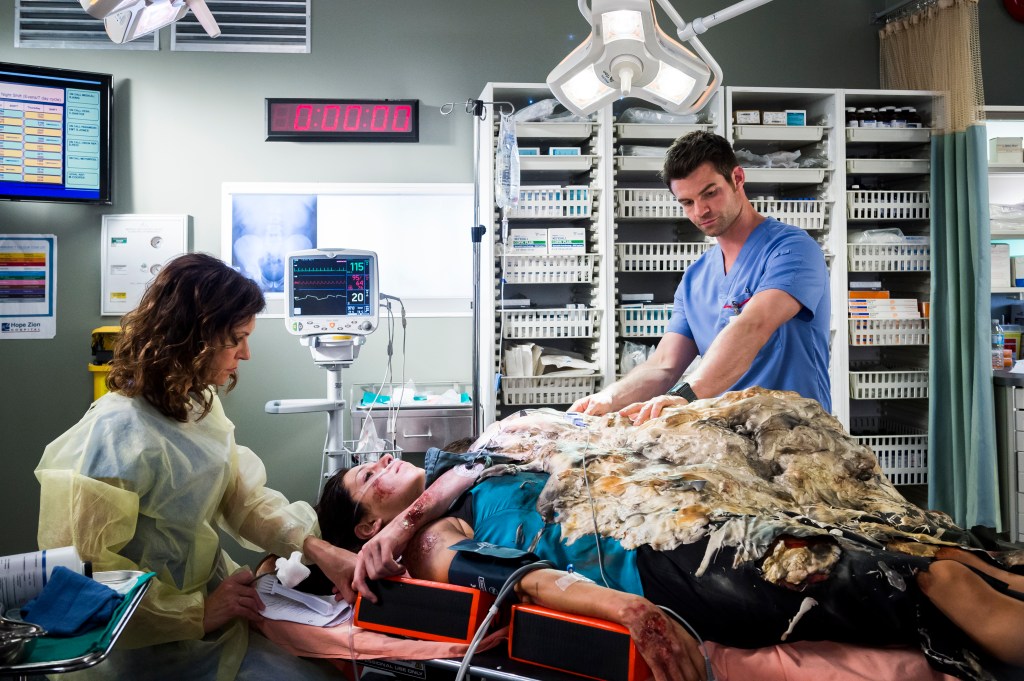 A condo explosion brings in tons of burn victims including a man and a woman fused together from some heated insulation. The man is the building’s electrician, Marshall, and the woman is the architect, Anna. It seems they were in the wrong place at the wrong time. Charlie and Joel argue over the best course of treatment but Charlie is called away and Dana takes over and the same debate ensues. The situation