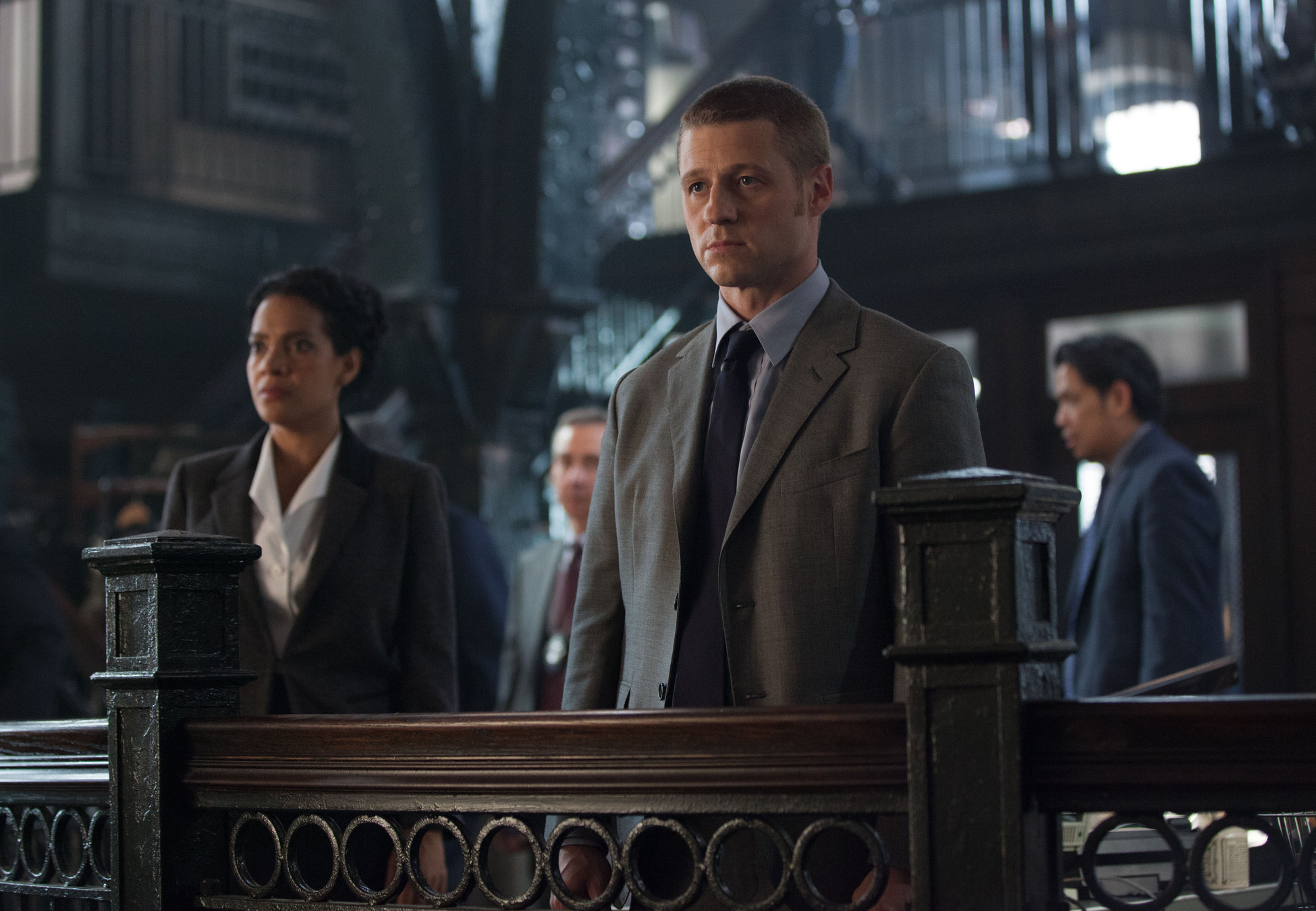 GOTHAM: An unwelcome visitor searches for Detective James Gordon (Ben McKenzie, R) at the GCPD in the “Penguin’s Umbrella” episode of GOTHAM airing Monday, Nov. 3 (8:00-9:00 PM ET/PT) on FOX. Also pictured: Zabryna Guevara. ©2014 Fox Broadcasting Co. Cr: Jessica Miglio/FOX