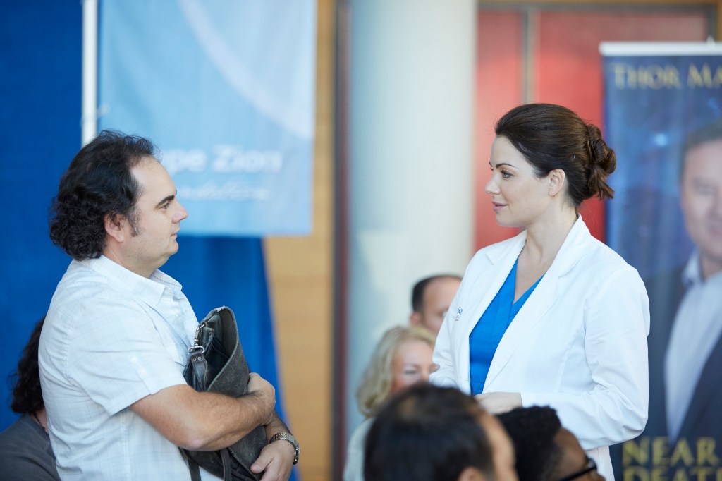Alex, Maggie and Dana are listening to renowned neurosurgeon Thor Maclead (Currie Graham) giving a lecture about his about that details his near death experience that involves an out of body experience of him watching his own surgery. Dana and Maggie snicker at the talk while Alex actually gets flashes of her own time in the spirit world and seeing her own body being operated on.