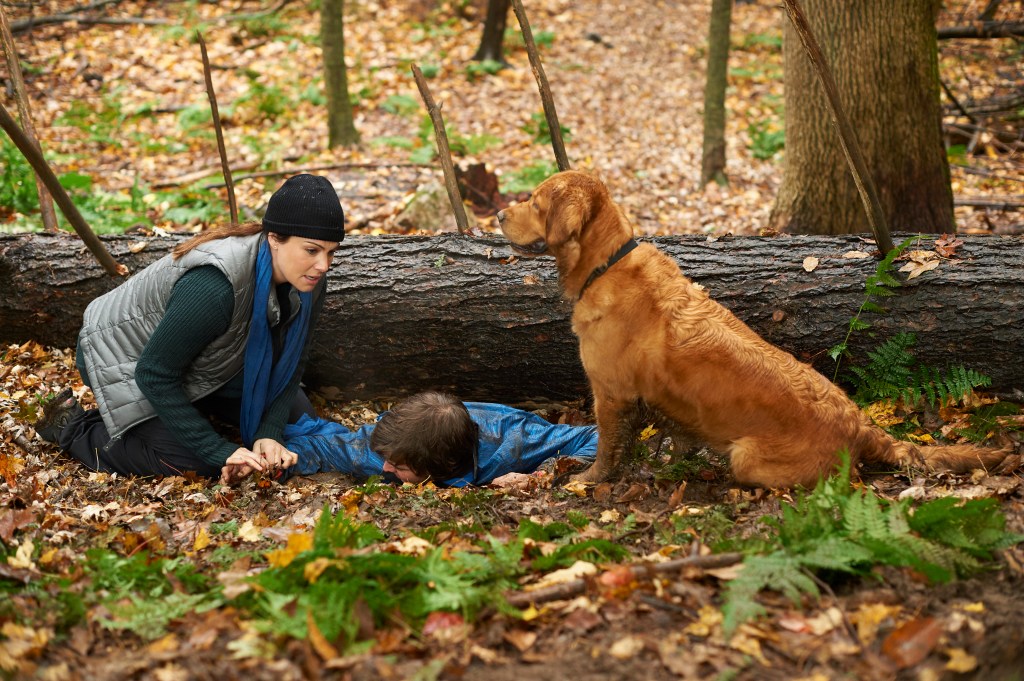 On her walk, Alex sees a golden retriever and a cry for help from a teen boy who is stuck under a huge log. Sam is the young teens and and his trusty dog is Farrow. Sam was out for a trail run the night before and storm blew down a tree onto him. Sam’s leg is broken so while Alex puts it in a splint gets him to tell a little bit about himself. Sam says he is allergic to peanuts and discusses things he likes such as Andy Samberg and talks about why likes running. Alex leaves to get better cell reception but before going gets Farrow to lie down on Sam to keep him warm.