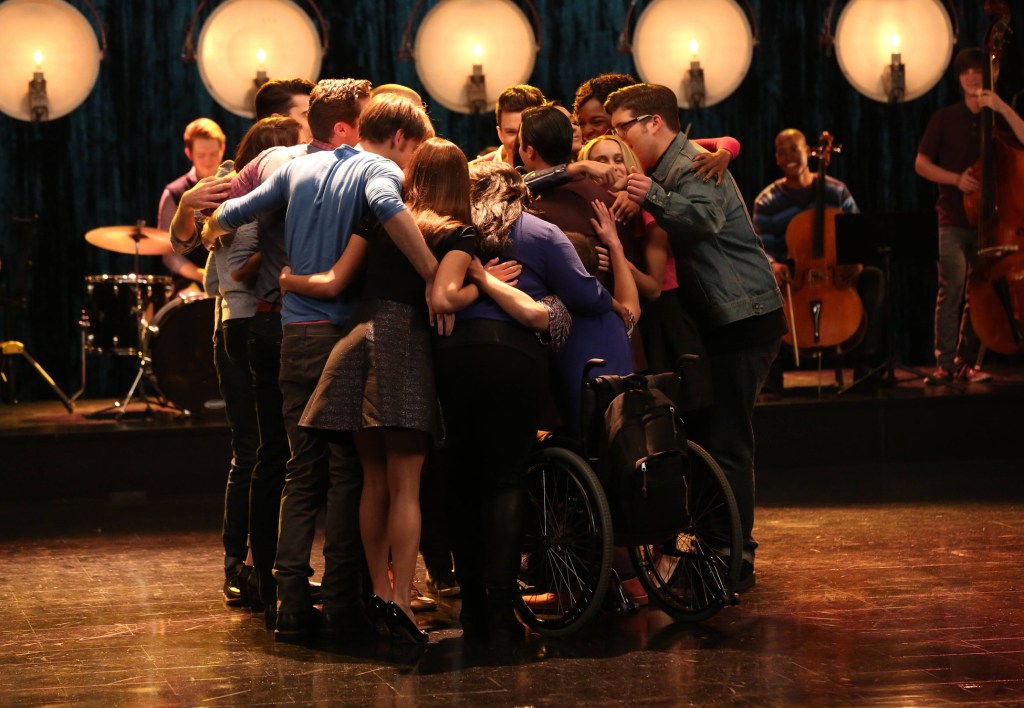 To help cheer Brittana up, the two ladies head to the auditorium where Artie, Rachel, Sam, Mercedes, Blaine, Mr. Shue and Kurt are their to support her and want to be part of the wedding party as they are all family now. Kitty offers the new kids to cater, hand out programs, do whatever to help at the wedding. The group then serenades the couple, who soon join them, to sing “What the World Needs Now.” The song is intercut with a party at Mr. Shue’s were we see Sam and Rachel getting closer, Artie and Kitty possible renewing their relationship, Santana and Brittany cooing over Danny Schuester and Kurt and Blaine being awkward friends. The song ends with one big group hug.