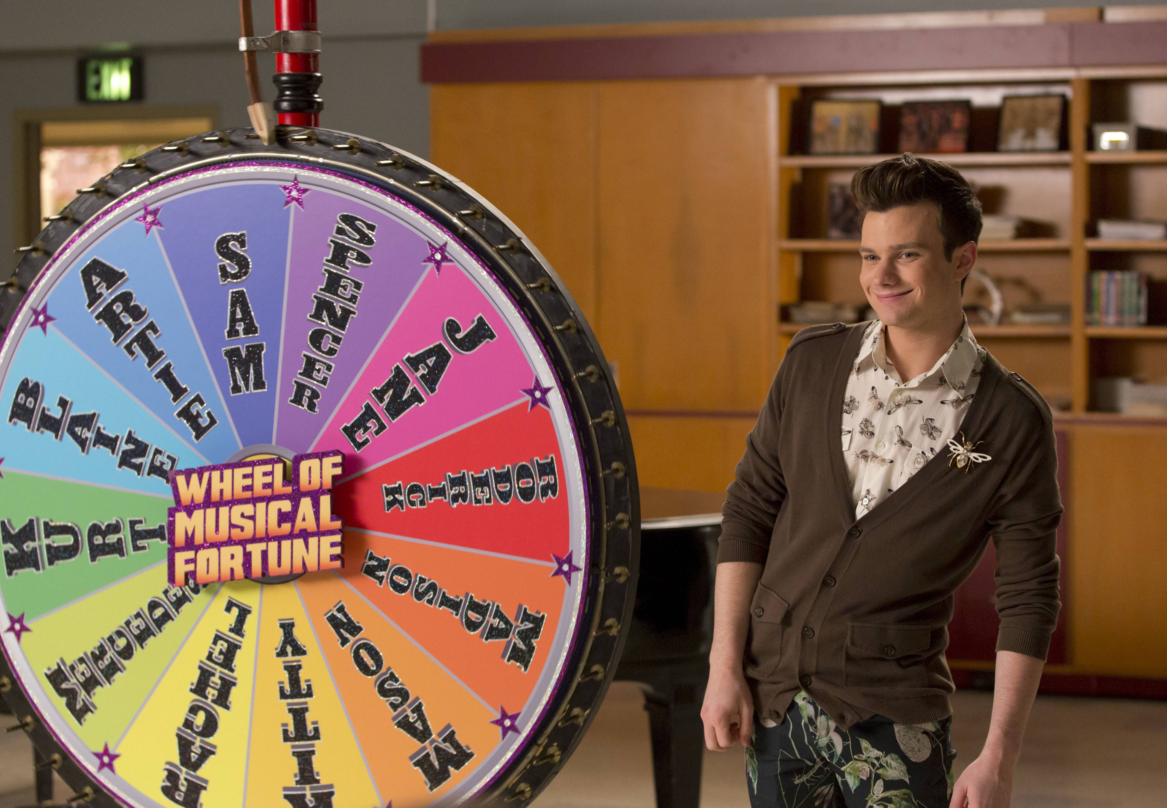 GLEE: Kurt (Chris Colfer) spins the wheel of musical fortune in the “Transitioning” episode of GLEE airing Friday, Feb. 13 (9:00-10:00 PM ET/PT) on FOX. ©2015 Fox Broadcasting Co. CR: Greg Gayne/FOX