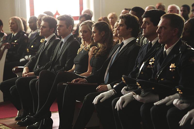 The funeral begins. The police force perform a lovely tribute honoring Sheriff Forbes and then it is time for Damon’s speech. He takes the time to tell Caroline what Liz’s last message to her was. He tells Caroline how proud her mom was of her and how she knew her daughter was an extraordinary person, which is true on multiple levels.