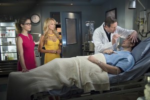 Arrow — “Public Enemy” — Image AR318A_0176b — Pictured (L-R): Emily Bett Rickards as Felicity Smoak, Charlotte Ross as Donna Smoak and Brandon Routh as Ray Palmer — Photo: Diyah Pera/The CW — é 2015 The CW Network, LLC. All Rights Reserved.