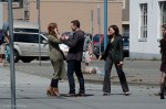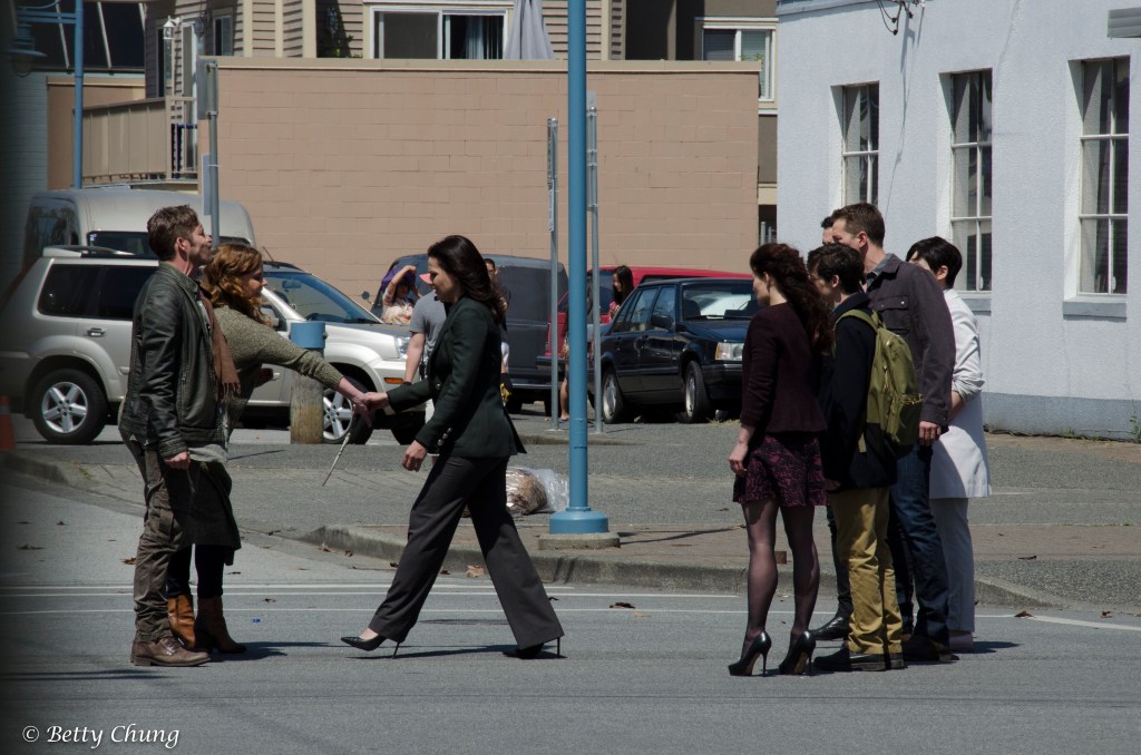 Last week, Once Upon a Time set up shop at Steveston to film scenes for an upcoming episode. From the photos and the video taken it looks like Regina (Lana Parrilla), Henry (Jared Gilmore), Hook (Colin O’Donoghue, Belle (Emilie De Ravin) and the Charmings (Ginnifer Goodwin and Josh Dallas) are about the face off with Zelena (new series regular Rebecca Mader) to save Robin Hood (also new series regular Sean Maguire) that involves a wand.