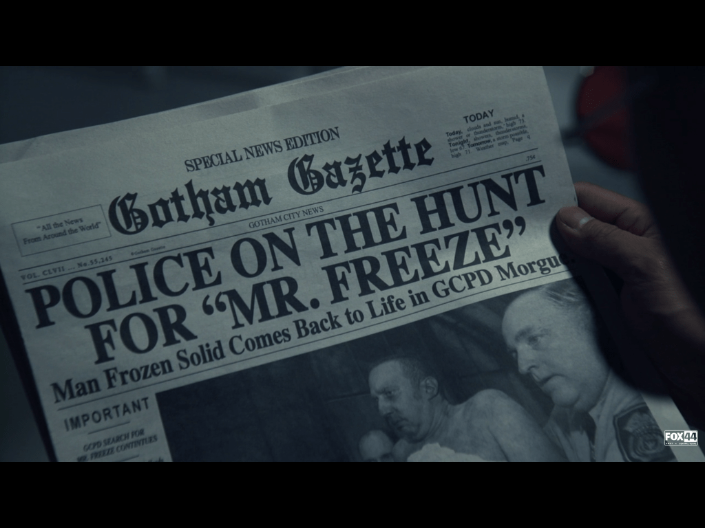 Nygma examines the popsicle-corpse of the pharmacist Fries was experimenting on in the medical examiners lab at the GCPD. He leaves for a moment to get some coffee but when he returns he notices that the body he was just examining is no longer present. Fries’ experiment has worked and this particular test subject has thawed out completely and walked into the main area of the police station. Victor Fries is also in the police station, waiting for the chance to speak with Detective Gordon to confess to freezing all those people. When Fries notices that his experiment has worked, he leaves the police station to devise a plan to save Nora.