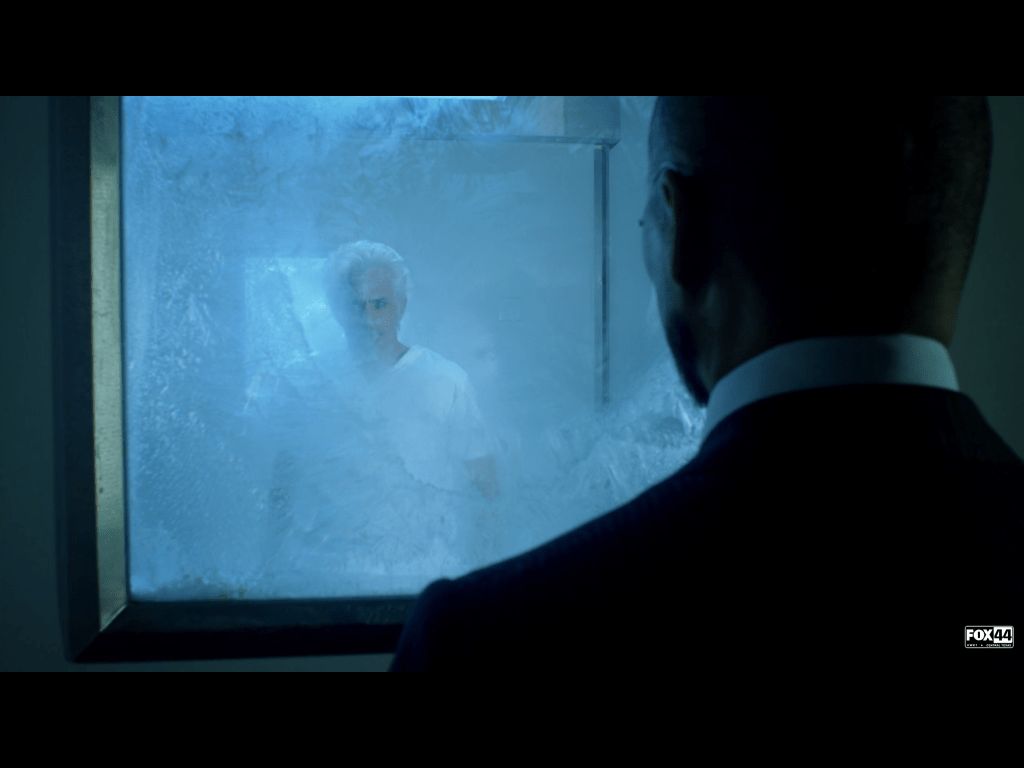 Nora Fries wakes up and frightened in the medical wing at the Asylum where she meets Leslie for the first time. She insists that Freeze is really a good guy who has lost his way trying to save his life. Leslie can relate to how Nora is feeling because she has been seeing the same attributes in Gordon lately. As the two women chat, a huge truck slams through the gate of the correctional facility. Once the truck comes to a halt the cops notice that the driver of the vehicle has frozen to the wheel of the car with no choice but to drive. The truck is just the distraction Freeze needs to burst through the wall of the asylum using his new freezing technique. Equipped with a new suit new gadgets Freeze makes his way toward the infirmary to save his wife. Some of the cops are in hot pursuit (no pun intended) until Freeze ambushes them with his ice bomb. While Gordon and Bullock lead another team toward after Freeze, Hugo Strange interferes unseen, triggering some automatic gates to block the paths of the officers. This gives Strange the opportunity to speak with Freeze over the PA system without being detected. Although Freeze can’t see Strange, he can steal hear him giving him advice on how to escape from the facility with his wife safely. In exchange for his assistance, Freeze agrees to leave Strange a bottle of his bionic ice formula. Freeze really has no choice but to trust Strange so he does as he’s told. Gordon arrives at the infirmary to try to evacuate Leslie and Nora but Freeze is not far behind him. Gordon knows he’s outmatched by Freeze’s ice gun so fighting is out of the question when Freeze appears behind him with the machine aimed to kill.