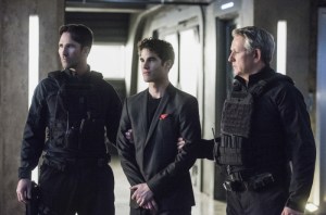 Their talk is interrupted by J’onn who introduces the team to a new villain (Darren Criss) being brought into custody. This villain who we know as the Music Meister is happy to see Kara as that is who he wanted to meet when he allowed the DEO to capture him. The Music Meister hypnotizes Kara into a coma, takes the interdimensional portal device to open one to Earth-1 to go after the Fastest Man Alive aka the Flash aka Barry Allen. As the Music Meister leaves through the portal, Winn grabs the interdimenstional portal clicker.
