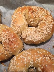 One of the things that I had difficulty with was when I dropped the shaped dough into the honey water that the circle didn’t hold its shape and I had some bagels that were more U-shape than bagel. Also, I only made sesame seed ones as I couldn’t find poppy seeds.
